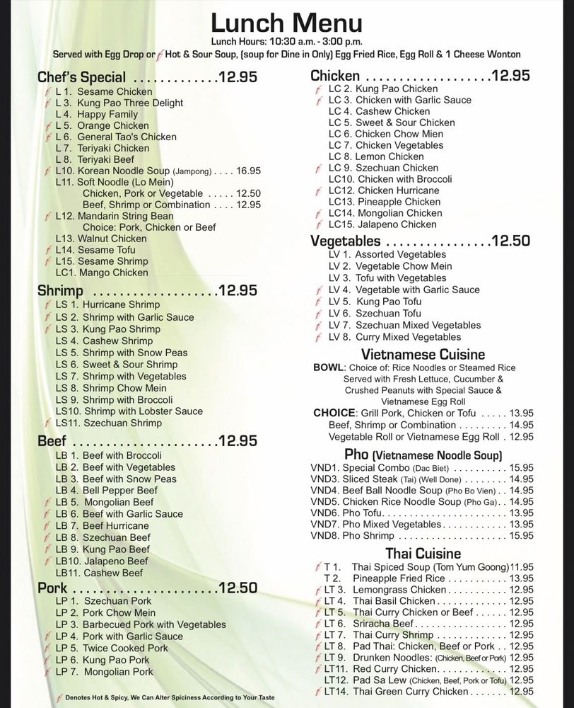 Cherry Village Asian Grill in Parker, CO offers a delightful fusion of Asian cuisine with a focus on Chinese and Vietnamese flavors. With a range of options from hot appetizers like Chicken in Lettuce Pockets to Chef's Specials like General Tao's Chicken, each dish is packed with authentic taste. Customers rave about the Beef Hurricane and the Vietnamese Egg Rolls, emphasizing the generous portions and reasonable prices. The welcoming staff and cozy atmosphere make dining in or ordering takeout a pleasant experience. Whether you're craving savory stir-fries or delicious pan-fried noodles, Cherry Village Asian Grill guarantees a satisfying meal. Don't miss out on their flavorful dishes and quick service that have made this spot a favorite for over 15 years..utf-8